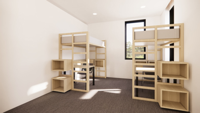 Double-occupancy bedrooms in a shared village-style housing unit
