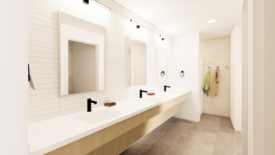 Multiple shared showers, toilets and sinks in each village-style unit