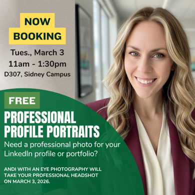 Do you need a professional photo to use as you begin looking for a career? How about a nice photo for your Canvas or LinkedIn profile? MCC is offering FREE professional photos on Tuesday, March 3, from 11 a.m. to 1:30 p.m. in room D307 in the Beatrice E. Doser Building on MCC's Sidney campus.
