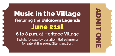 Heritage Village will host local band The Unknown Legends from 6 to 8 p.m. Admission is by donation and refreshments will be available for purchase at the event.
